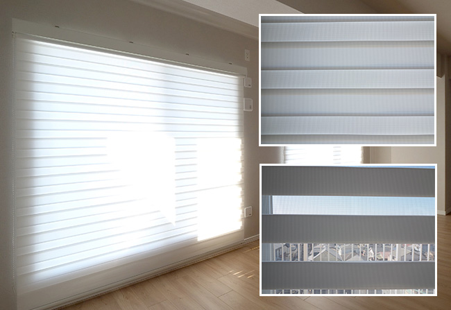 リビングの掃き出し窓に設置したロールスクリーンは、上下に開閉することで日差しの量を調整し、外の景色を楽しむことができます。