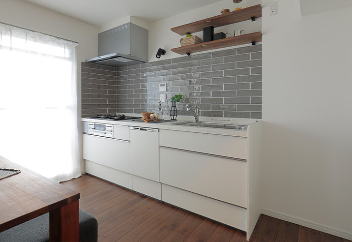 キッチンはタイル風のパネルを張り、オープンラックを設置。カフェのような雰囲気に仕上げました。濃い色の床とも相性が良くヴィンテージ調の家具を置いてもマッチしそうです。