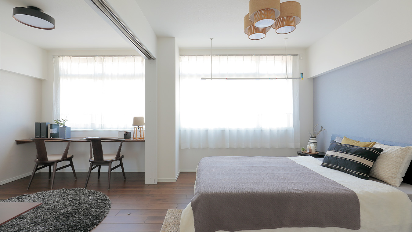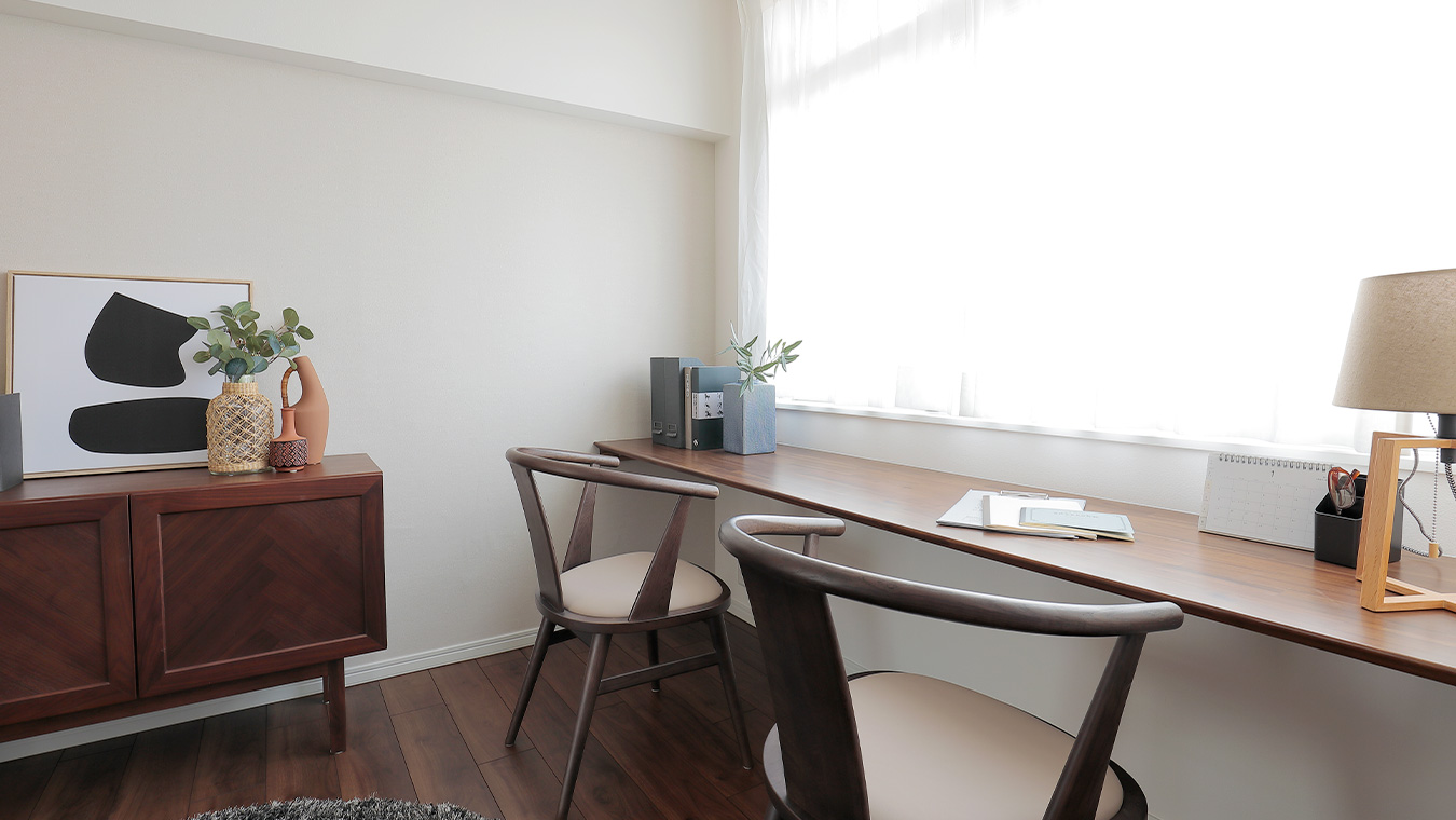 洋室の壁紙やフローリングはリビングと統一し、落ち着いた印象です。奥の窓側にはデスクカウンターを設けました。