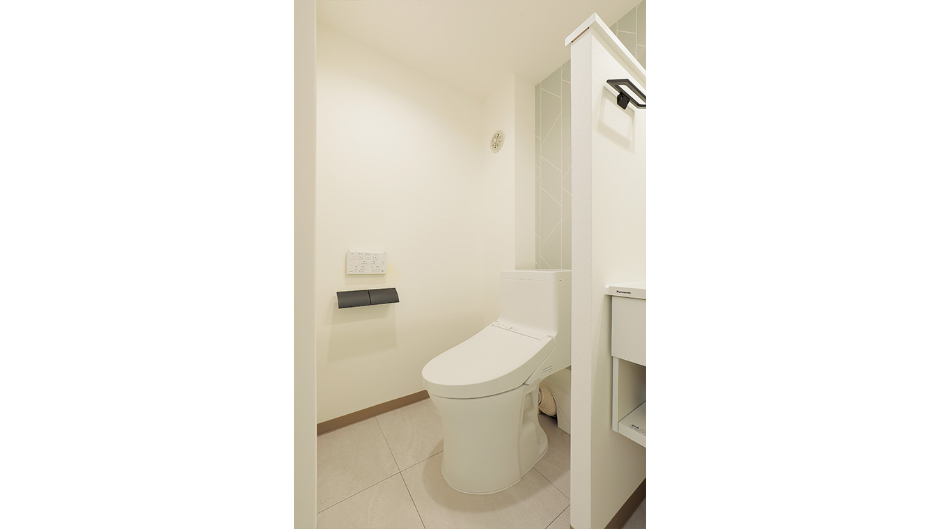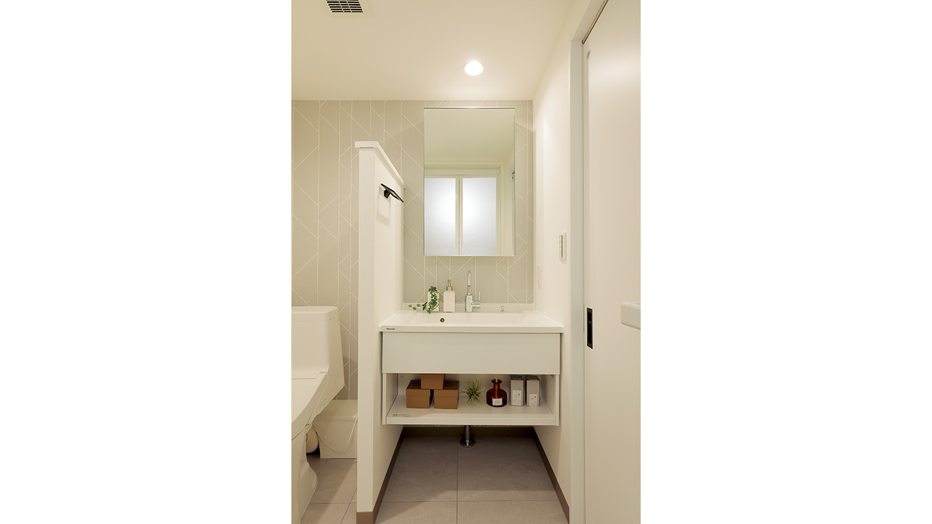 トイレと洗面スペースは仕切らずシームレスに。単身またはDINKs向けの住まいだからできる、限られた空間を広く見せる工夫です。