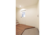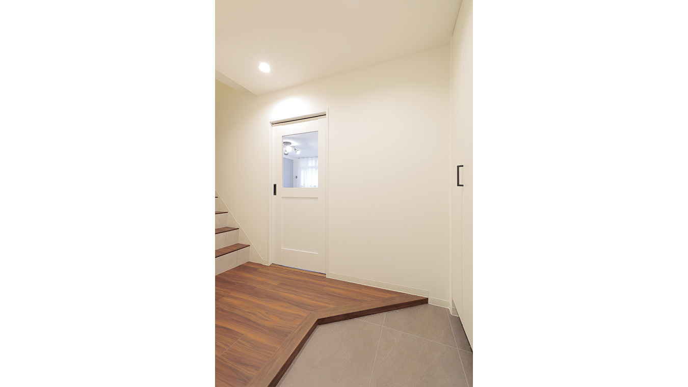 間口の広い玄関。正面は1階リビングに続くドア。