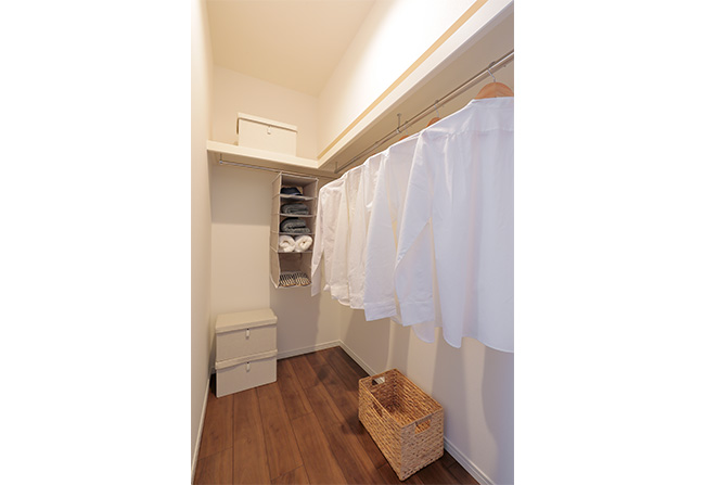 2階の洋室の奥に造作したウォークインクローゼットはこの住まいのメイン収納です。洋服やスーツケース、季節ものの家電を収納するのに適しています。