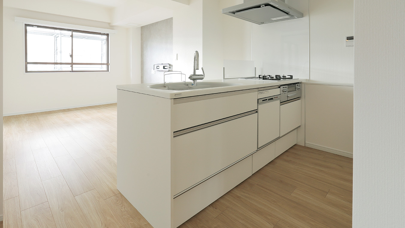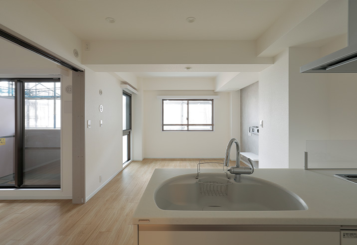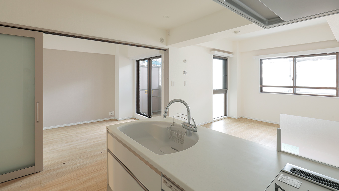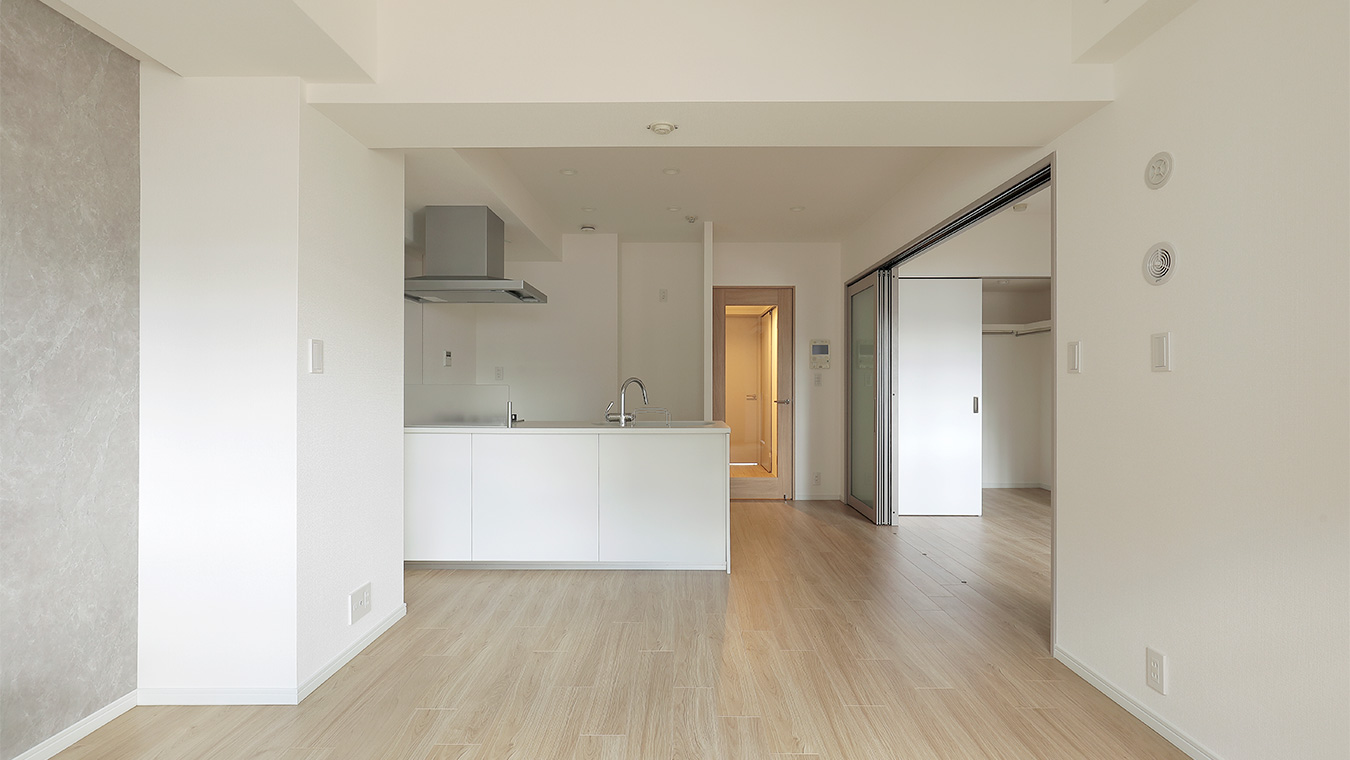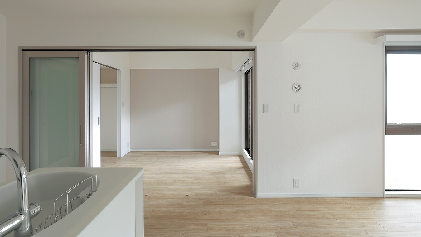 リビングは壁紙やフローリング、キッチンを白系でまとめました。洋室の扉を開けるとさらに採光も良く、とても明るい印象です。