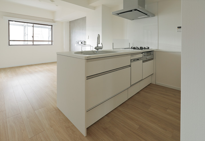 キッチンはリビングに対面する向きに変更しました。炊事をしながら家族とのコミュニケーションも取りやすい設計です。