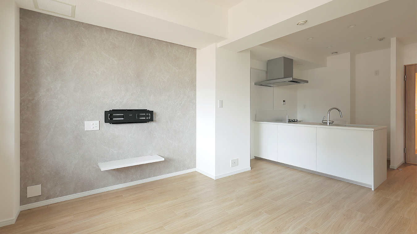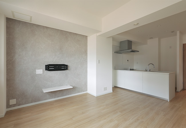 アクセントクロスを施したリビングの壁にはテレビを壁掛けできるよう、金具を取り付けました。リビングを広く使うことができます。