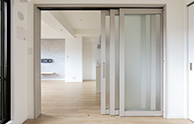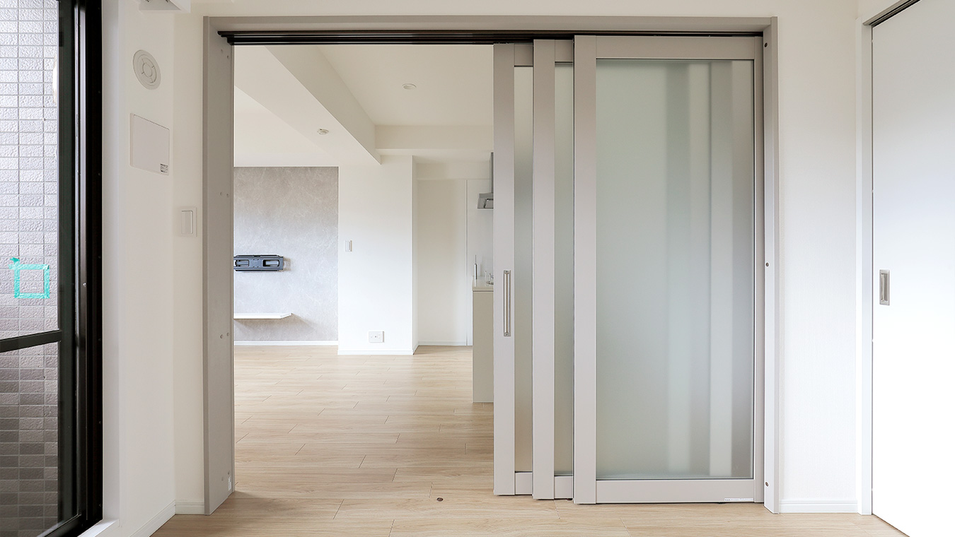 リビング横の洋室はガラスの3枚引き戸で仕切っています。開放するとリビングの一部として、閉めると洋室としてご利用いただけます。