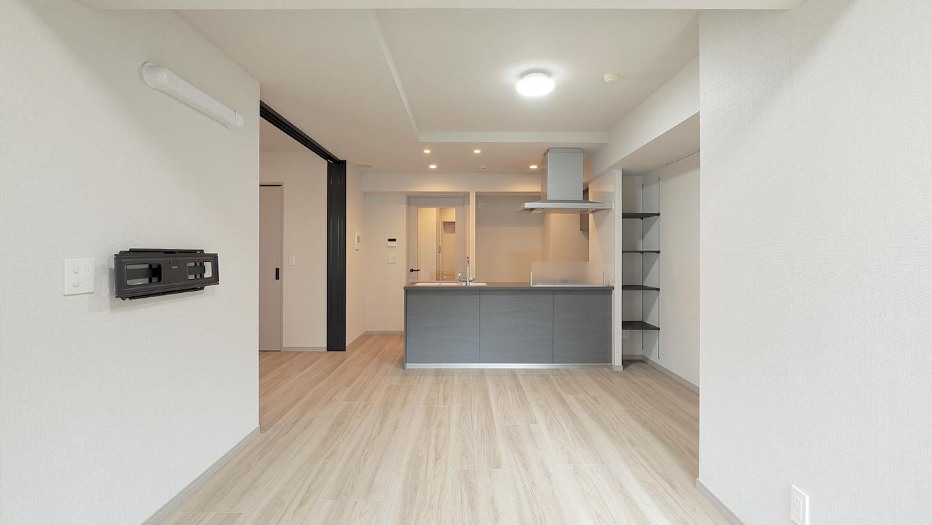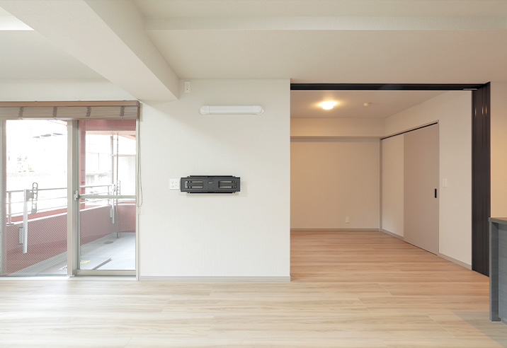 リビングと洋室を仕切っていた壁は一部を残し取り払い、ガラスの3枚引き戸を設置しました。開放すると広々としたリビングになります。壁は補強し、テレビを壁掛けできるようにしました。
