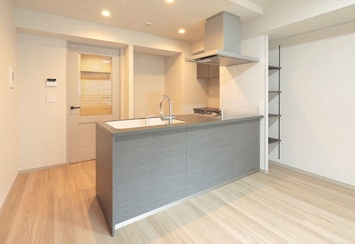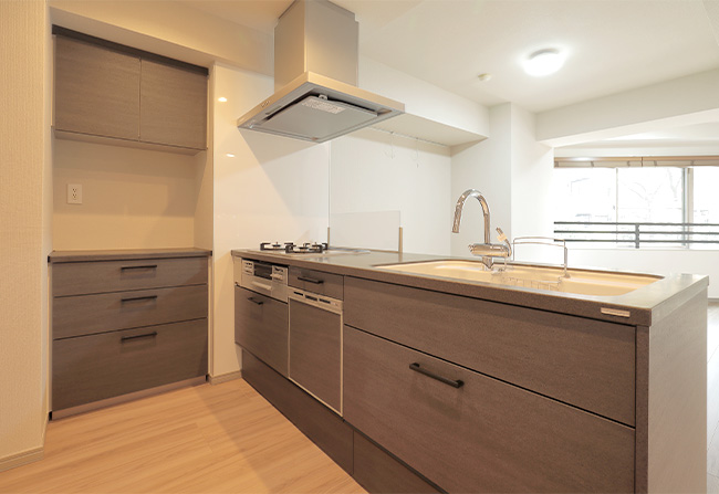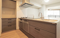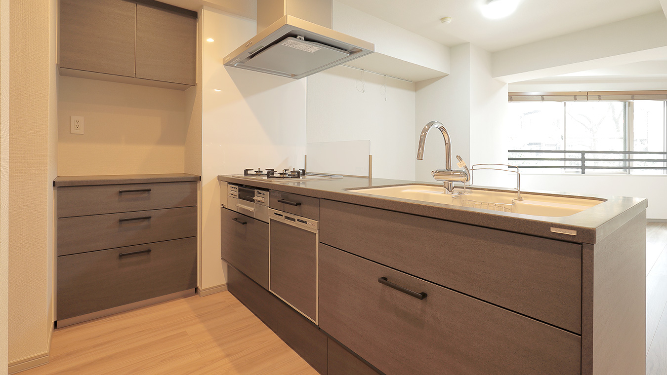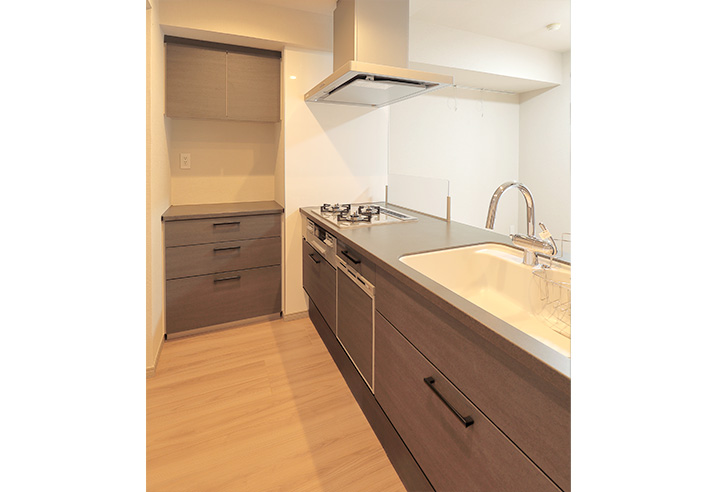 ハイグレードなオープンキッチンを採用。天板の人造大理石もダークな色調でまとめ、より高級な印象に。美しいフォルムの水栓が特徴的です。