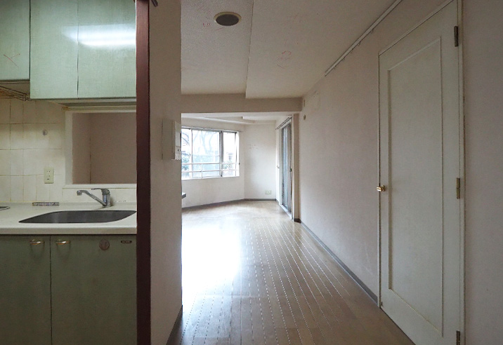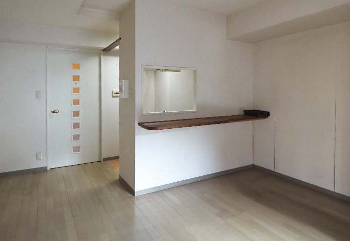 リビングから見たキッチンです。以前は壁があり孤立していましたが、壁をなくしてオープンな対面キッチンに作り替えたため、炊事をしながら家族とのコミュニケーションを取ることができます。