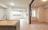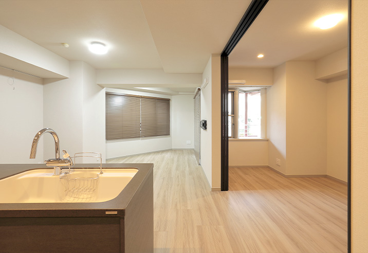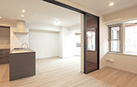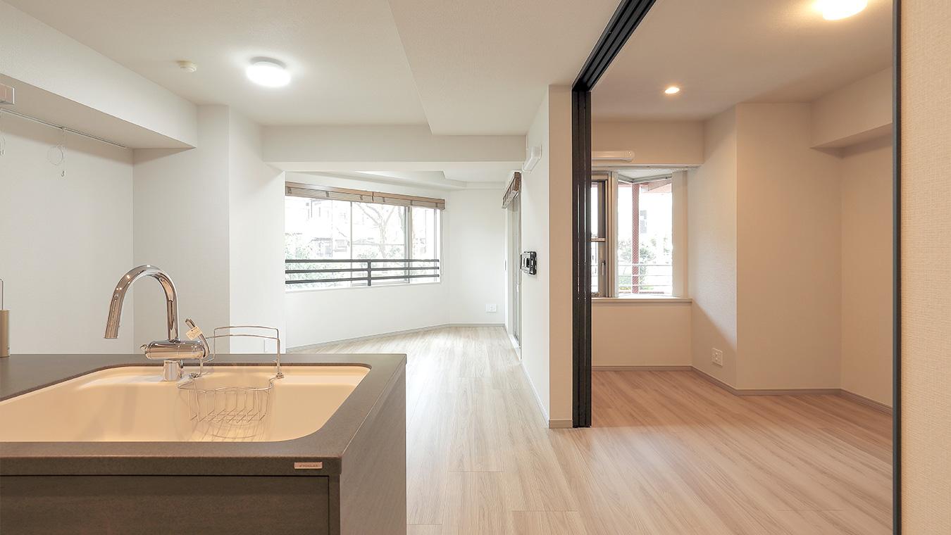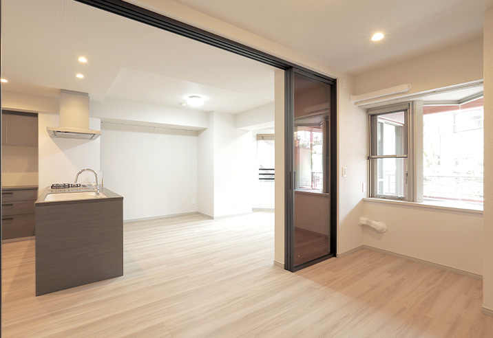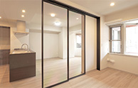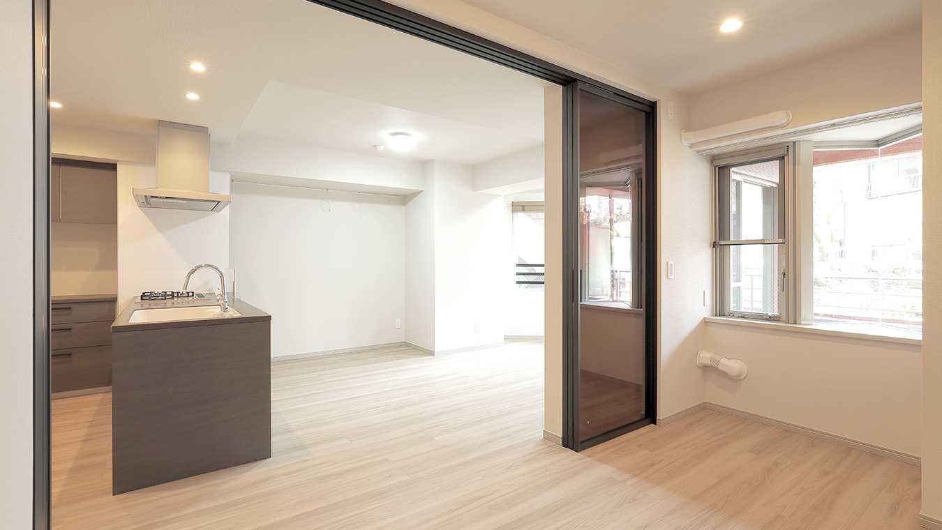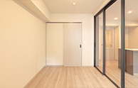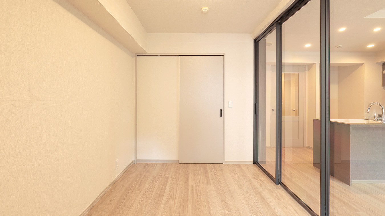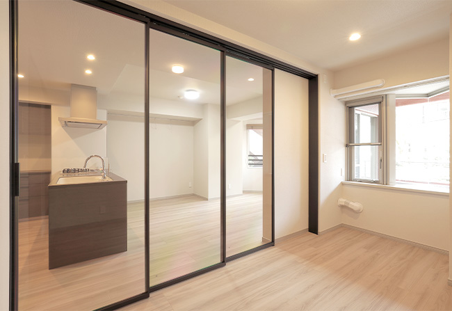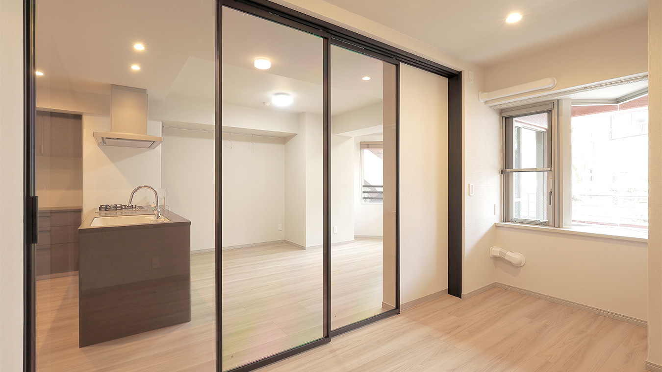 ガラスの引き戸からはリビングからの採光たっぷり。一人暮らしやお二人で住まわれる方にうれしい、開放的な住まいです。