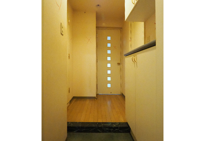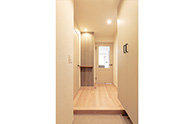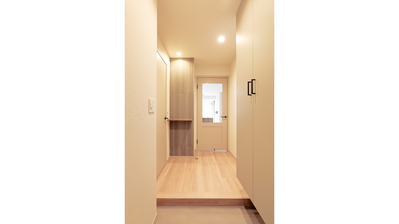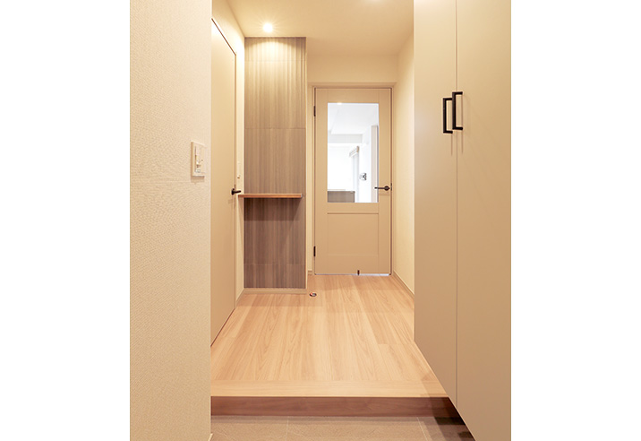 カウンター型だったシューズボックスは、天井近くまでの大型収納に。正面の飾り棚の壁は調湿・吸臭効果のあるエコカラットに。入室した際のアクセントになり、こもりがちな空気をスッキリさせてくれます。