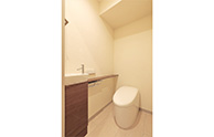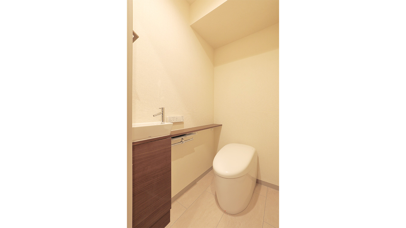 トイレもスタイリッシュなタンクレス型を採用し、手洗いカウンターを設けました。