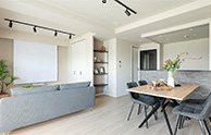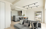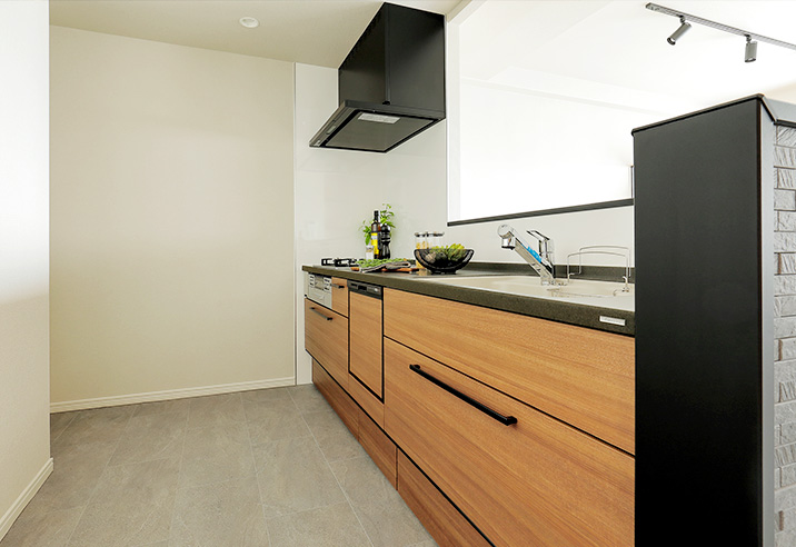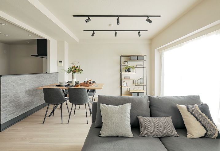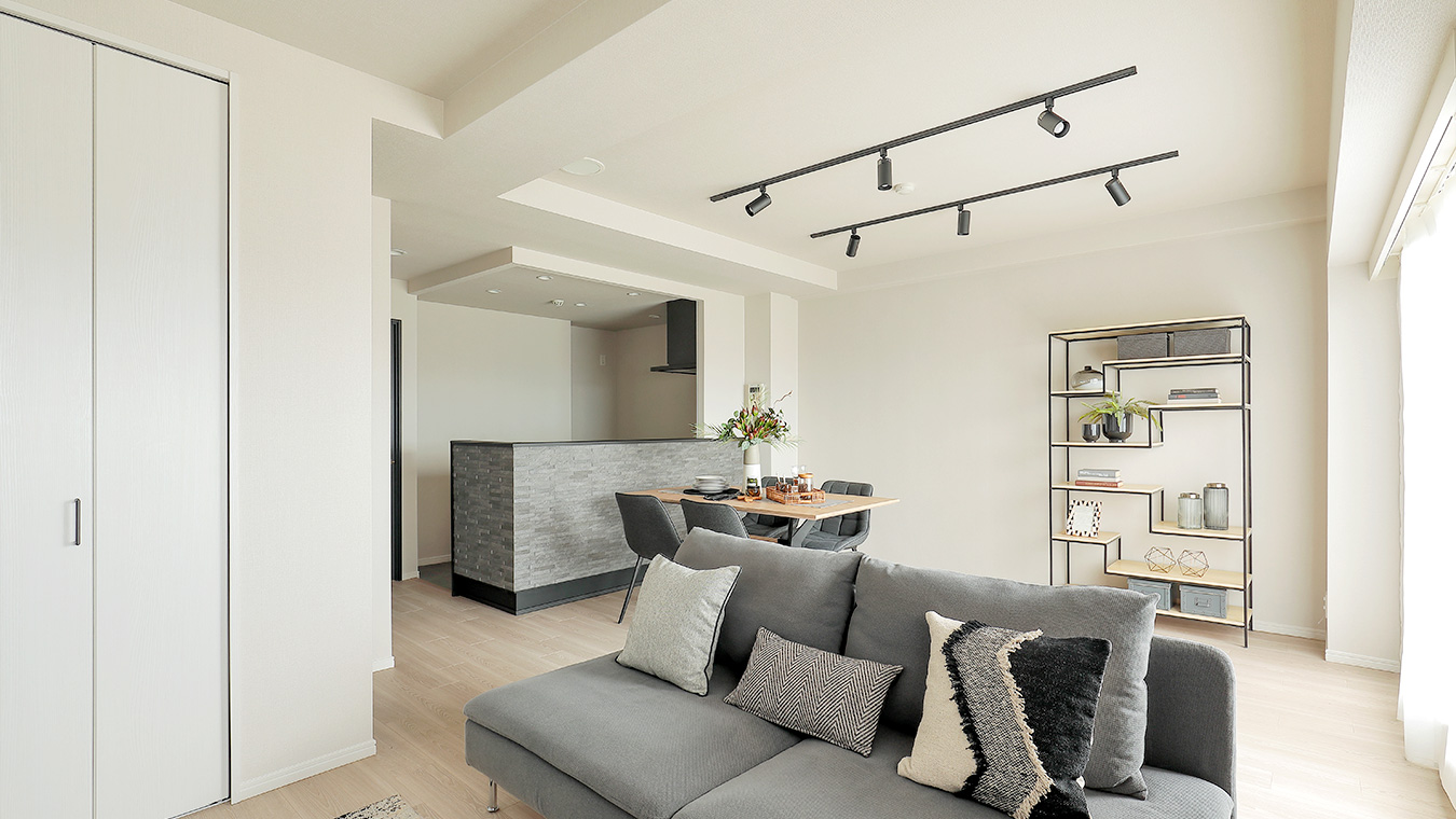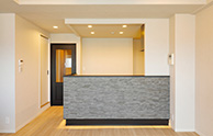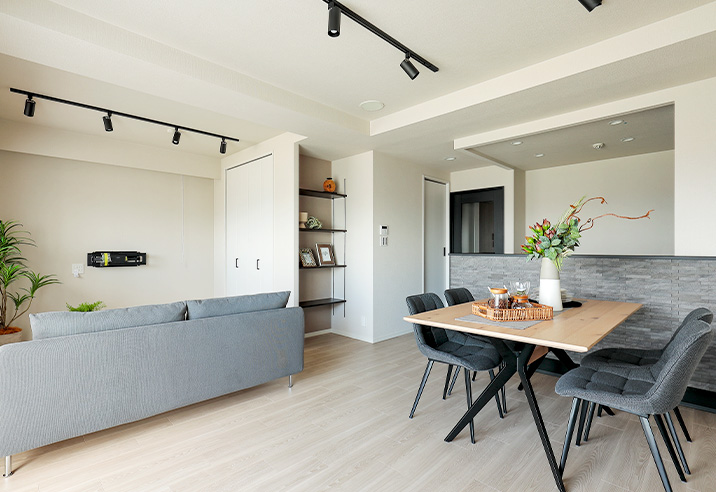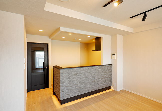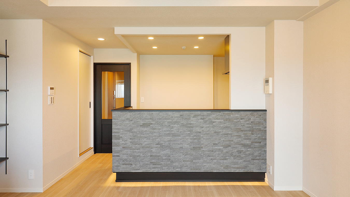 キッチンはペニンシュラ型を採用し、グレーの腰壁にはエコカラットを採用しました。調湿性に優れ、リビング側の見た目もシンプルでモダンな印象です。足元には間接照明を設置し、高級感を演出します。