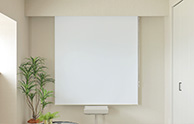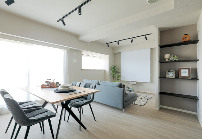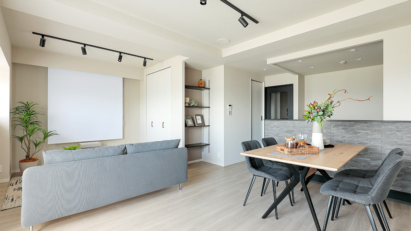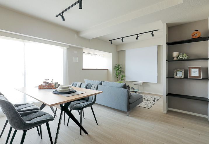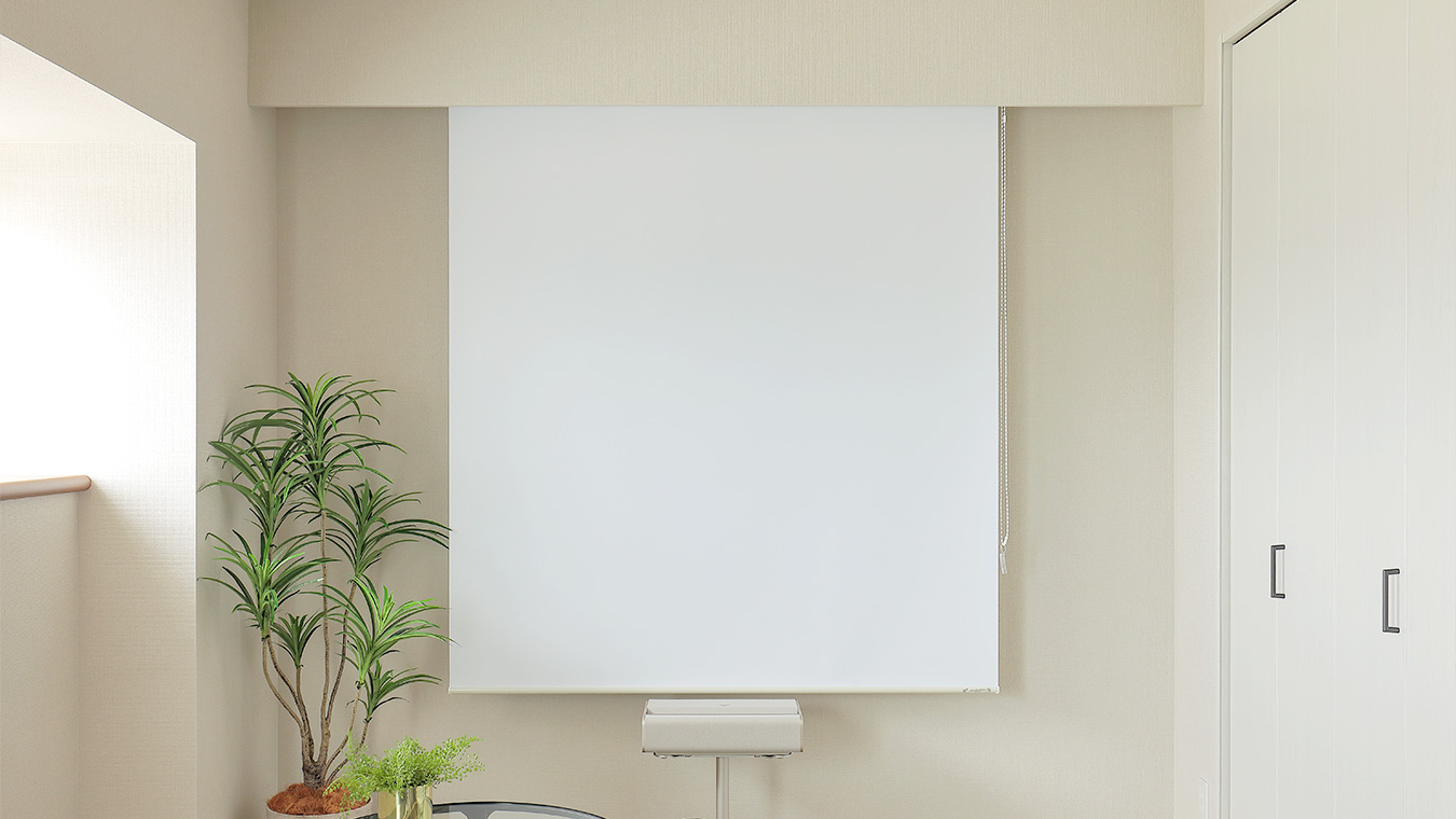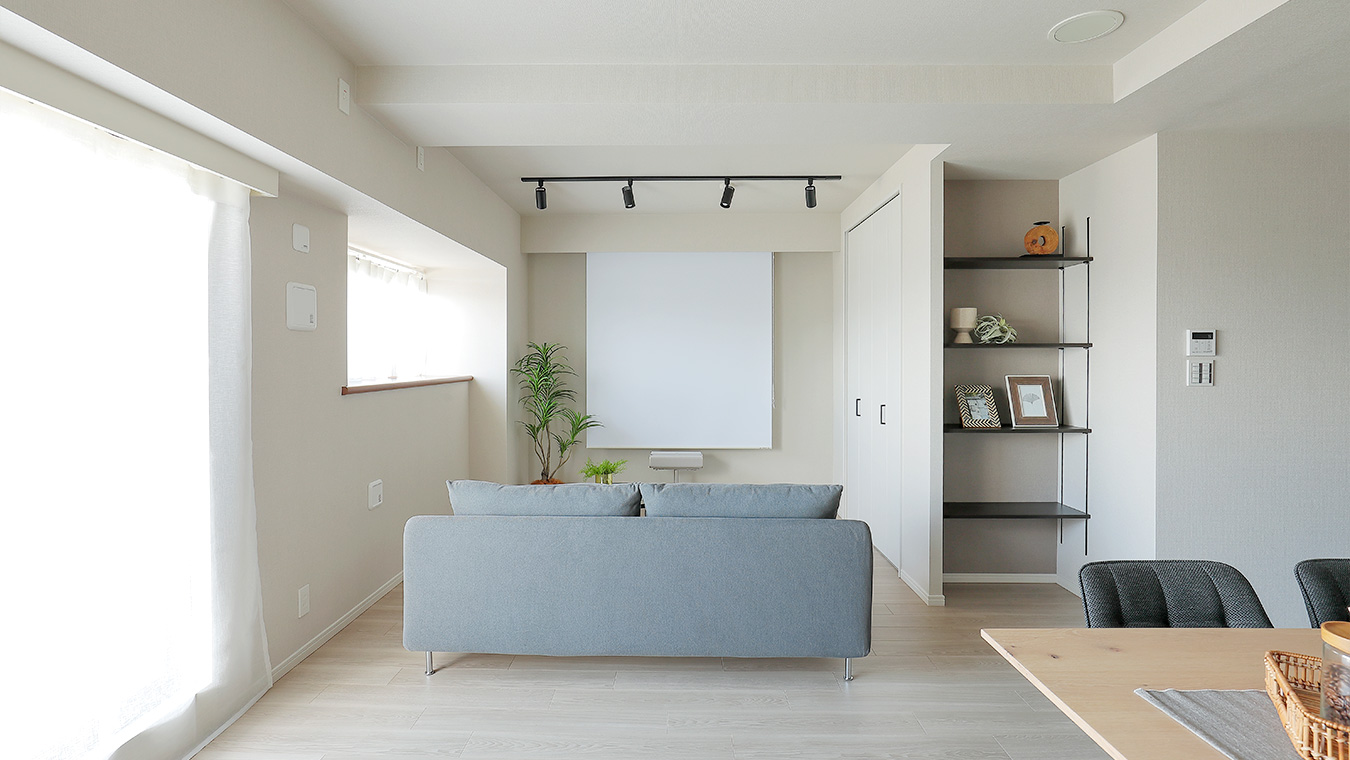 リビングの一角には上げ下げできる大型のスクリーンを設置しました。ホームシアターとして映画やドラマ、スポーツなどを大画面で楽しむことができ、家族の“おうち時間”がより豊かに。