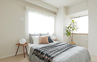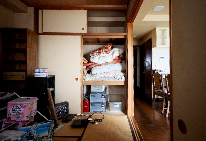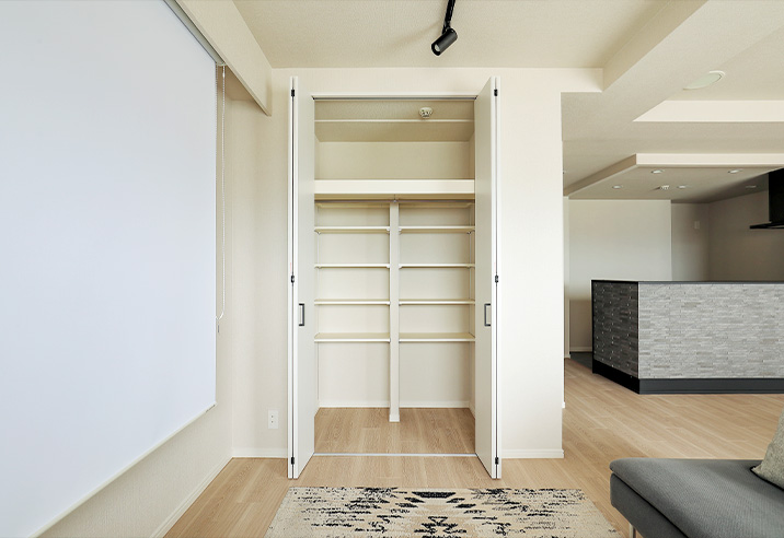 元々和室だったお部屋の押入れ部分はクローゼットに。日用品のストックや掃除用具、布団などさまざまなものを収納できるファミリークローゼットです。