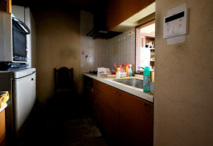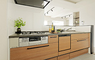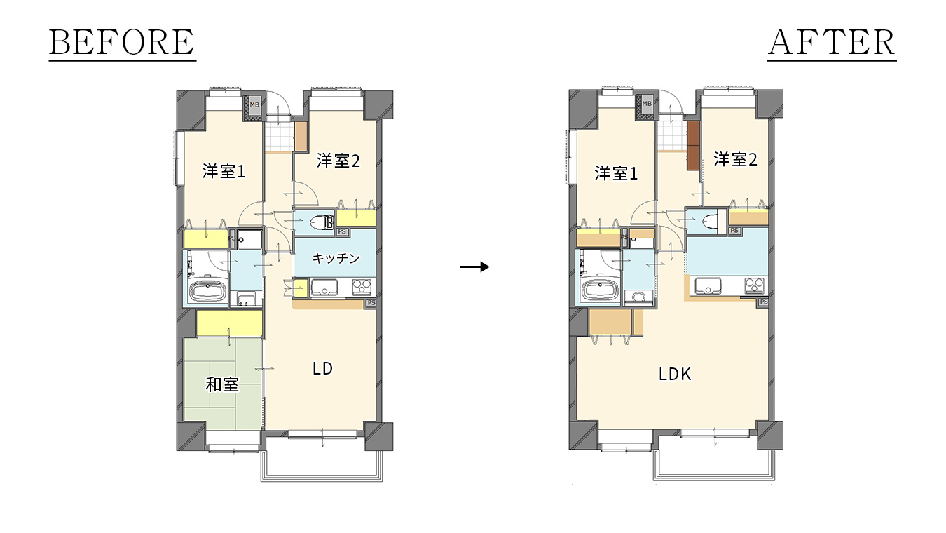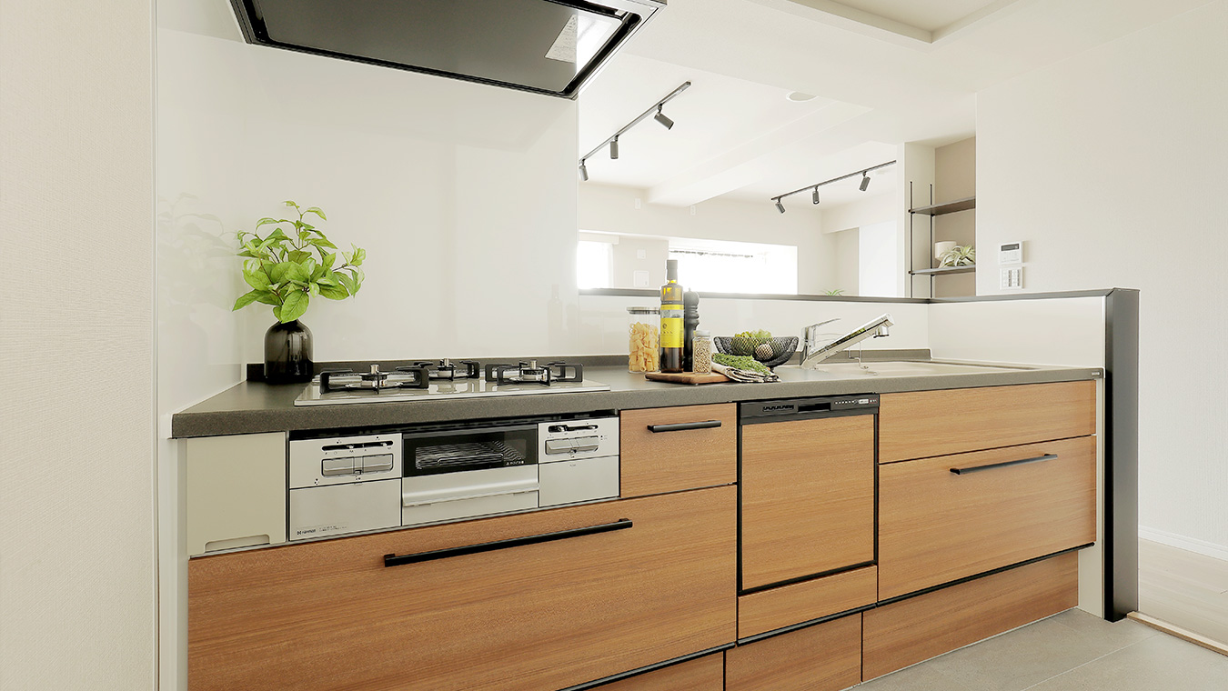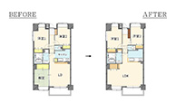 半個室状態だったキッチンは大きく壁を取り払い、リビングの様子を伺いながら炊事をすることができます。また、リビングからの採光で明るいキッチンに生まれ変わりました。