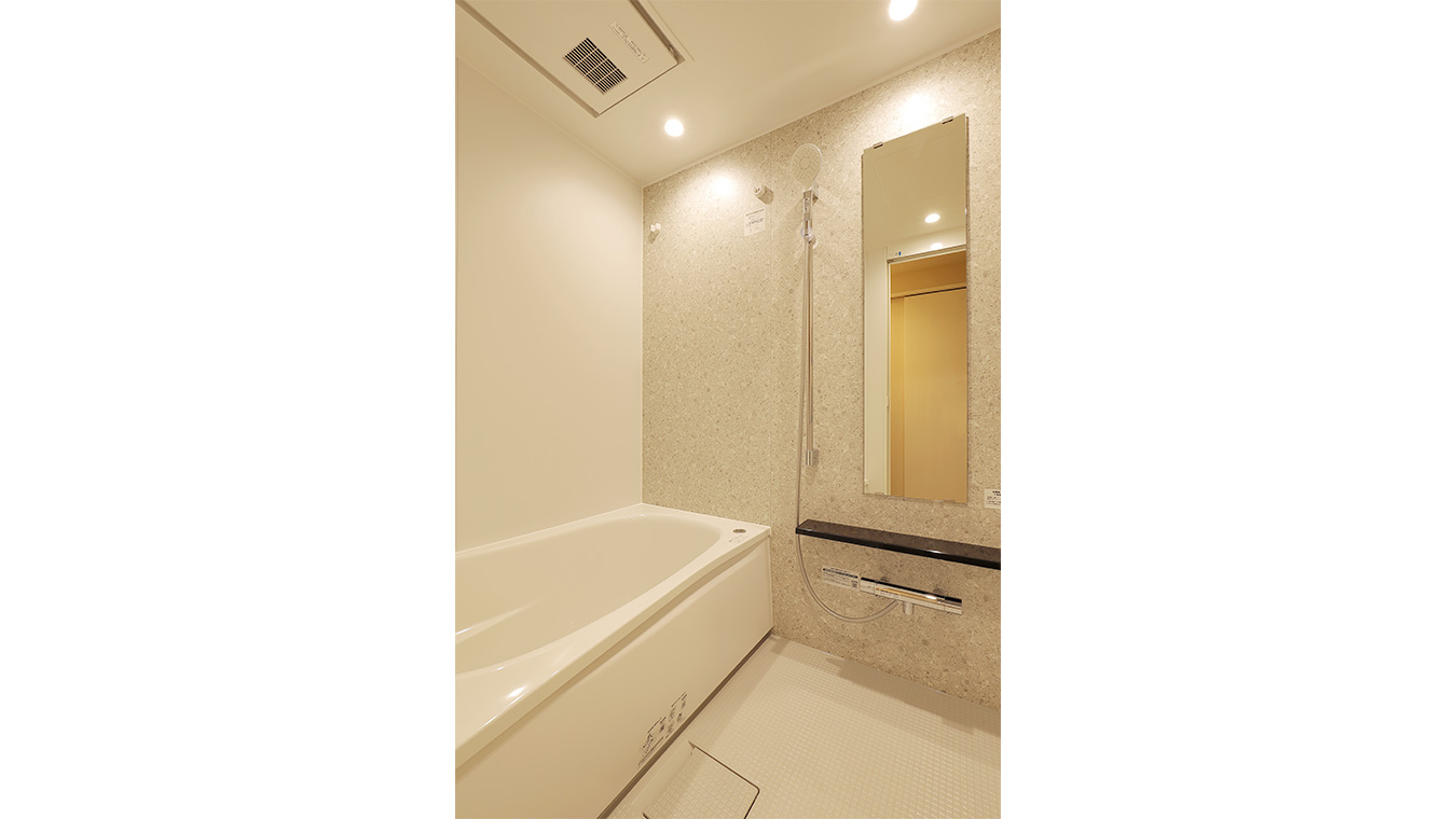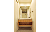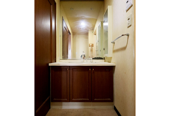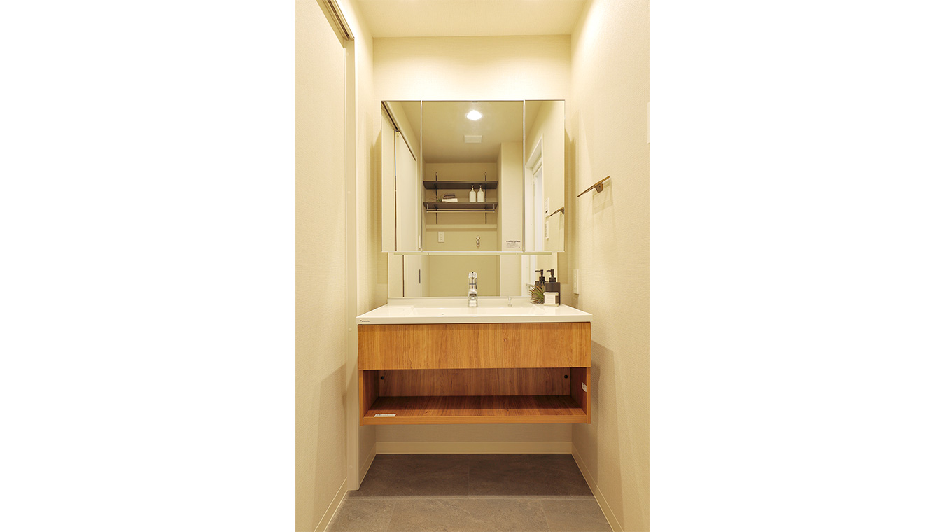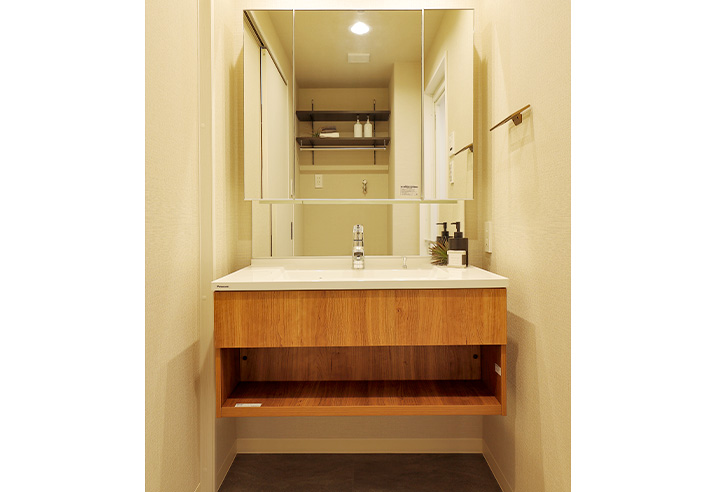 元々大きな一面鏡だった鏡は、裏側に収納のある三面鏡タイプに。足元のスペースには体重計や洗濯かごなどを置くことができます。