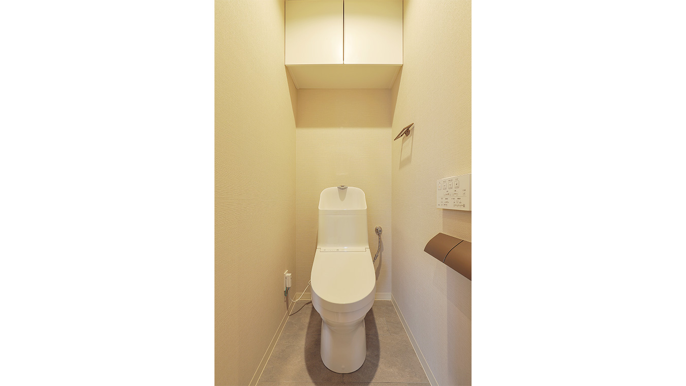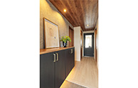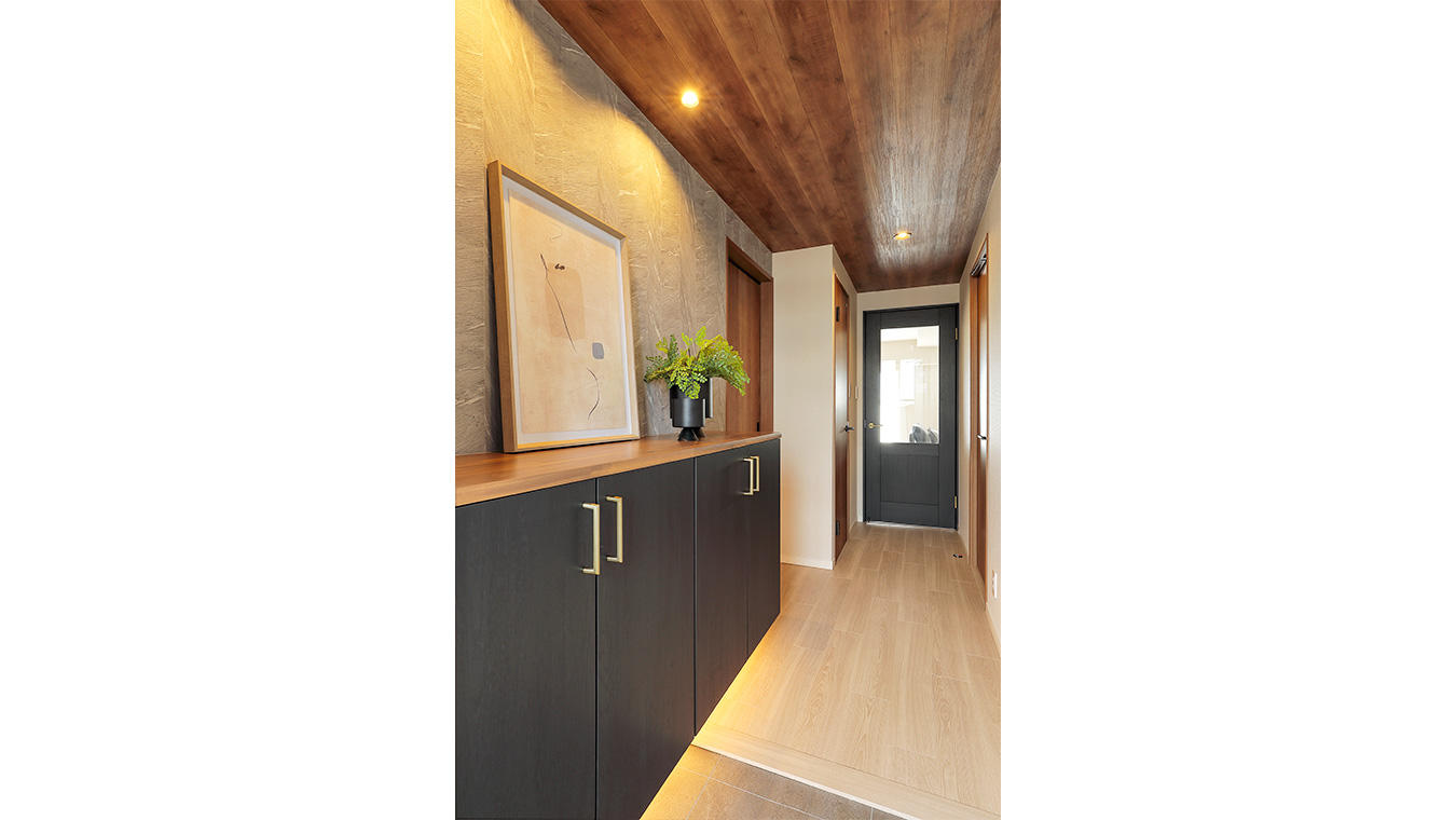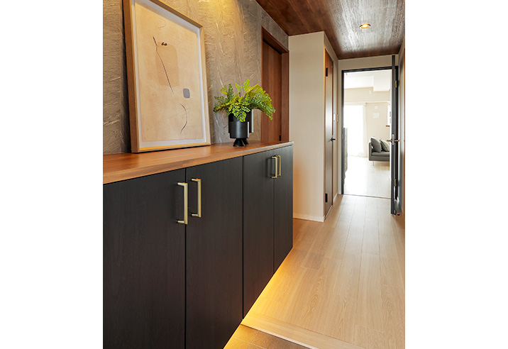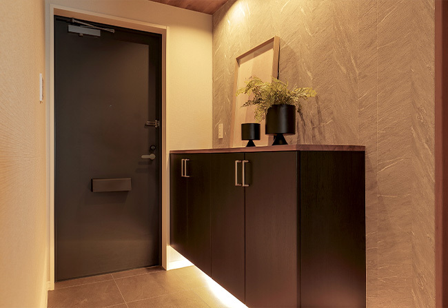 シューズボックスはロータイプのダーク系を採用。圧迫感がなく、アクセントクロスとの組み合わせがおしゃれです。シューズボックスの足元にも間接照明を設置し、高級感を演出します。