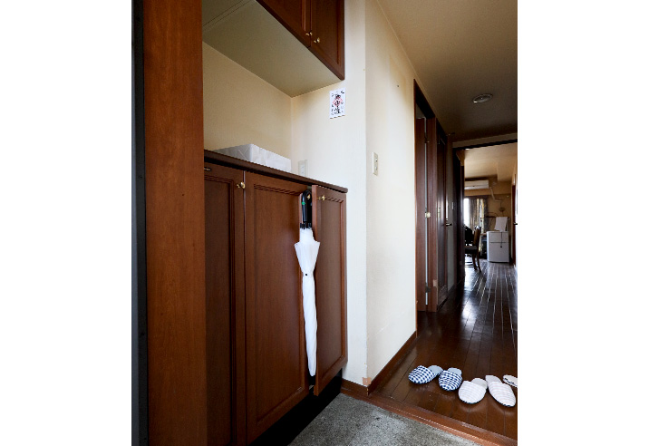 圧迫感をなくすために吊り戸棚をなくした玄関収納。その分、廊下を広げてシューズボックスを増設しました。玄関から廊下の横幅が広がり、ゆとりのあるエントランスになりました。