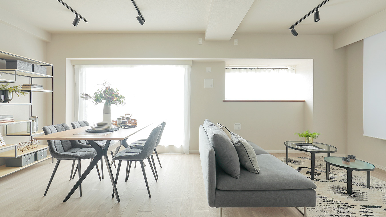 白とナチュラル系を基調とした内装で仕上げたリビングは、照明なしでもLDK全体に光がまわります。
